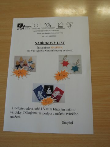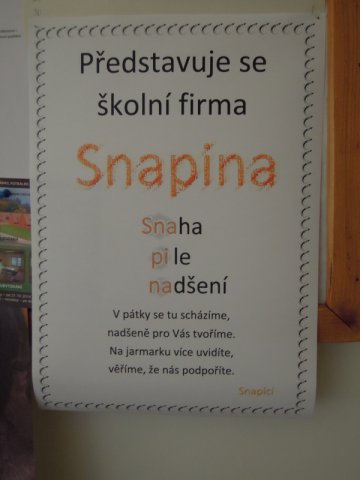 Dne 25.11.2014 se v prostorách ZŠ Jungmannova Litovel konal tradiční Vánoční Jarmark na němž byla představena i školní minifirma SNAPINA. Žáci zde předvedli ukázku svého snažení v kroužku a návštěvníkům nabízeli ručně vyráběné Vánoční dekorace ze dřeva a Vánoční přáníčka.